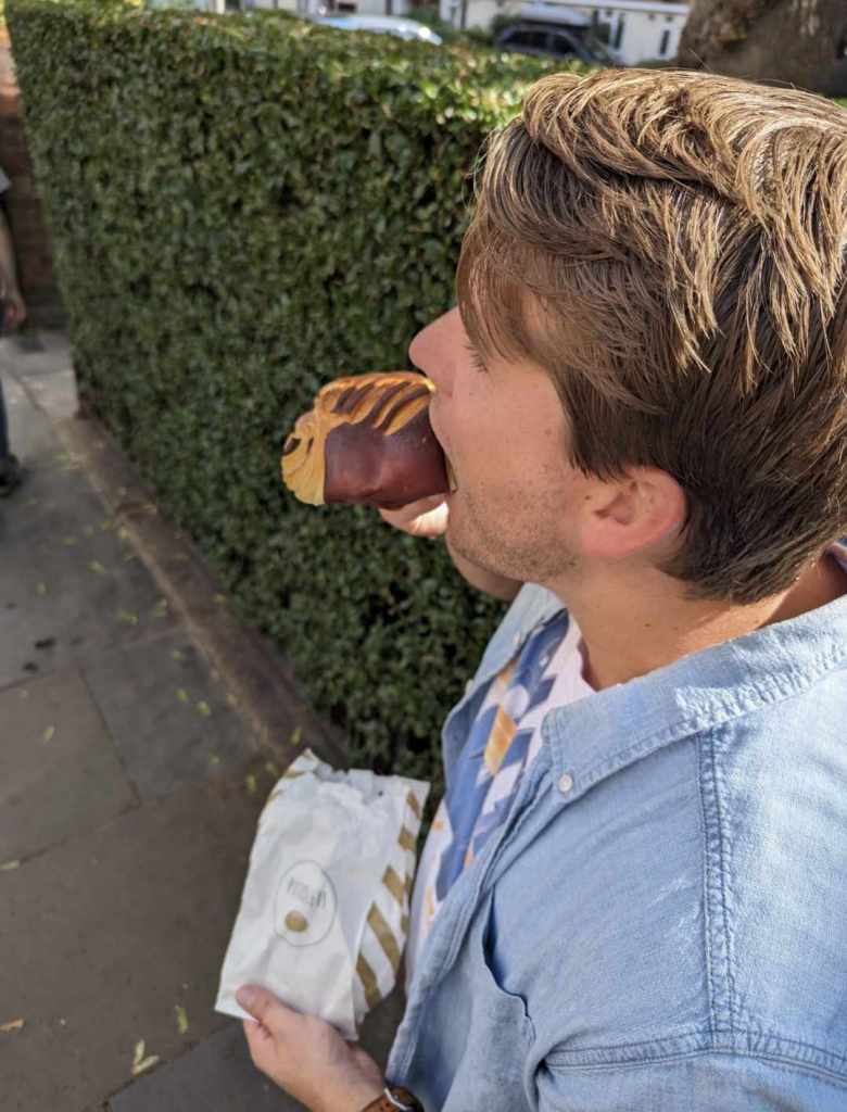 Probably one of my best, if not the very best, idea I’ve ever had for Tanner’s birthday was this year’s Chocolate Croissant Tour of London. If you know Tanner, the man can PUT chocolate croissants DOWN. During a trip to Thailand a few years ago, our hotel had a conveyor belt toaster with a stack of mini chocolate croissants next to it and I am 99% sure Tanner would have sold his soul to the devil to take that croissant conveyor belt home. So, for the big 28 this year, I decided it was time to put the British chocolate croissants to the test!